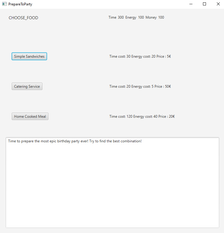 A short java game to plan a birthday party and trying to find the best combination of options. You need java installed to play.